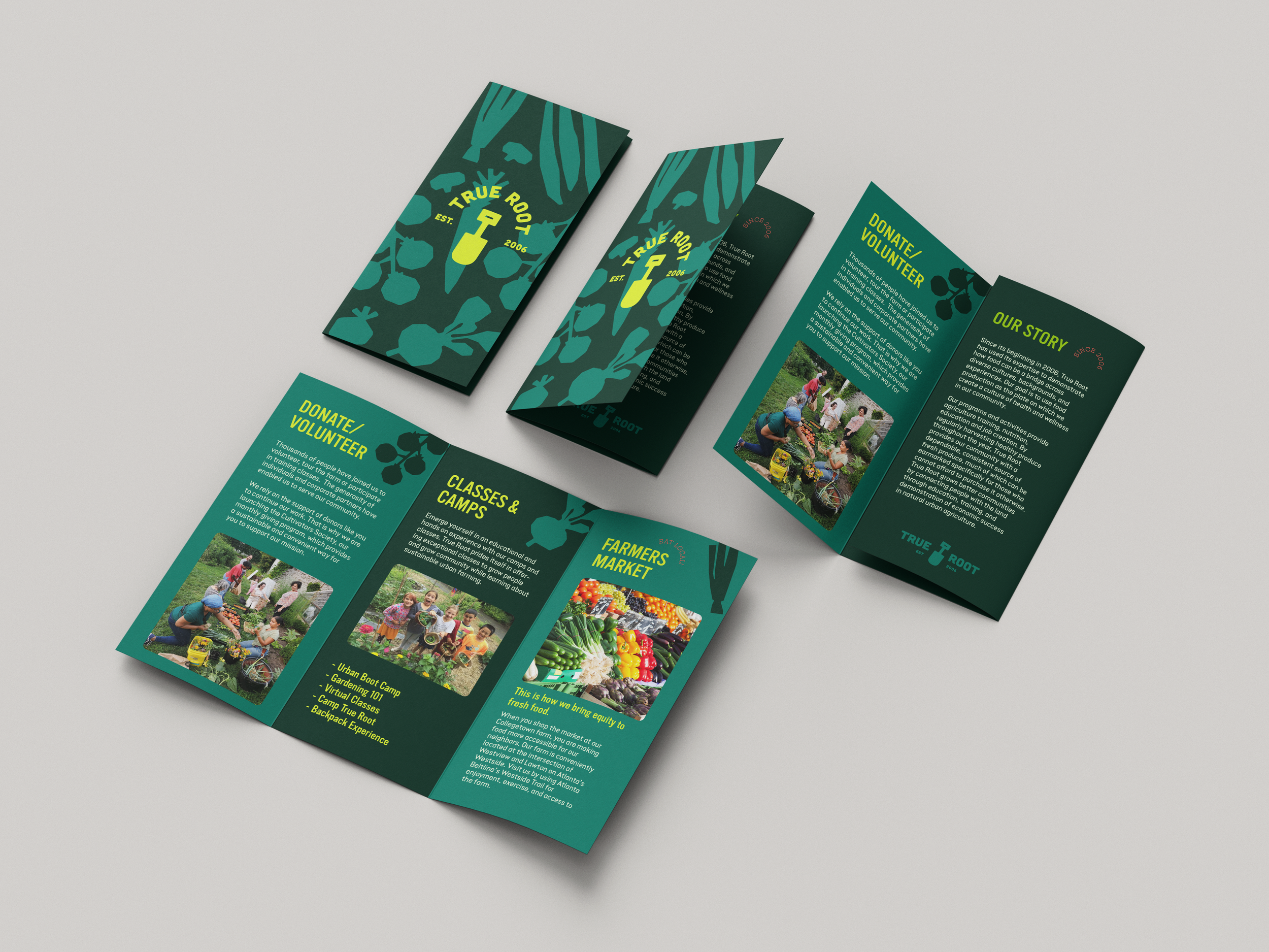 True Root is a rebrand I worked on with Whit Taylor for an Atlanta-based urban farm. Whit built the brand system — logo, color palette, and typography — and I focused on bringing it to life across applications: Instagram content, brochures, tote bags, and merchandise. The result is an identity that feels as rooted in the community as the farm itself.