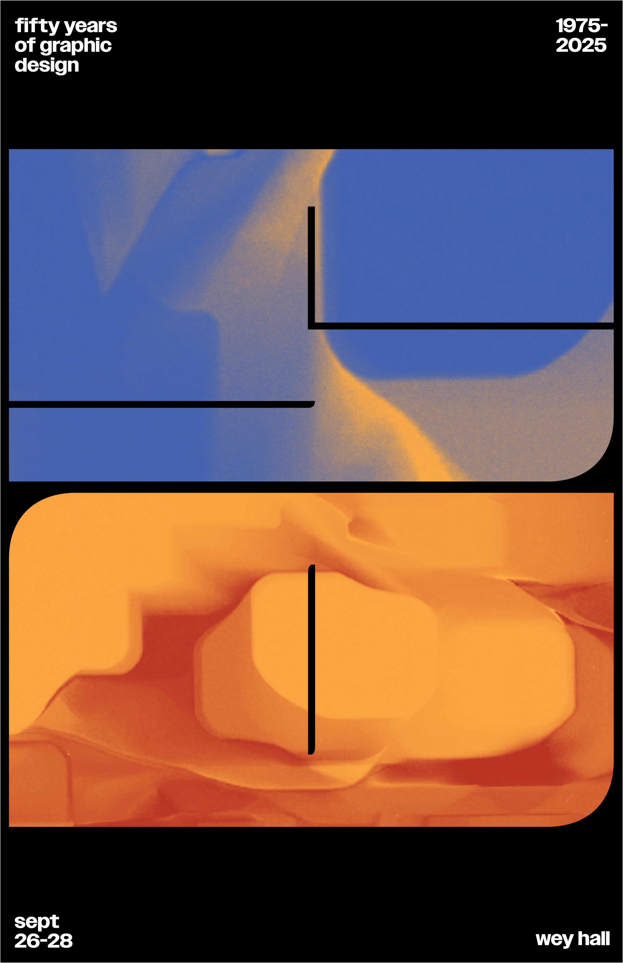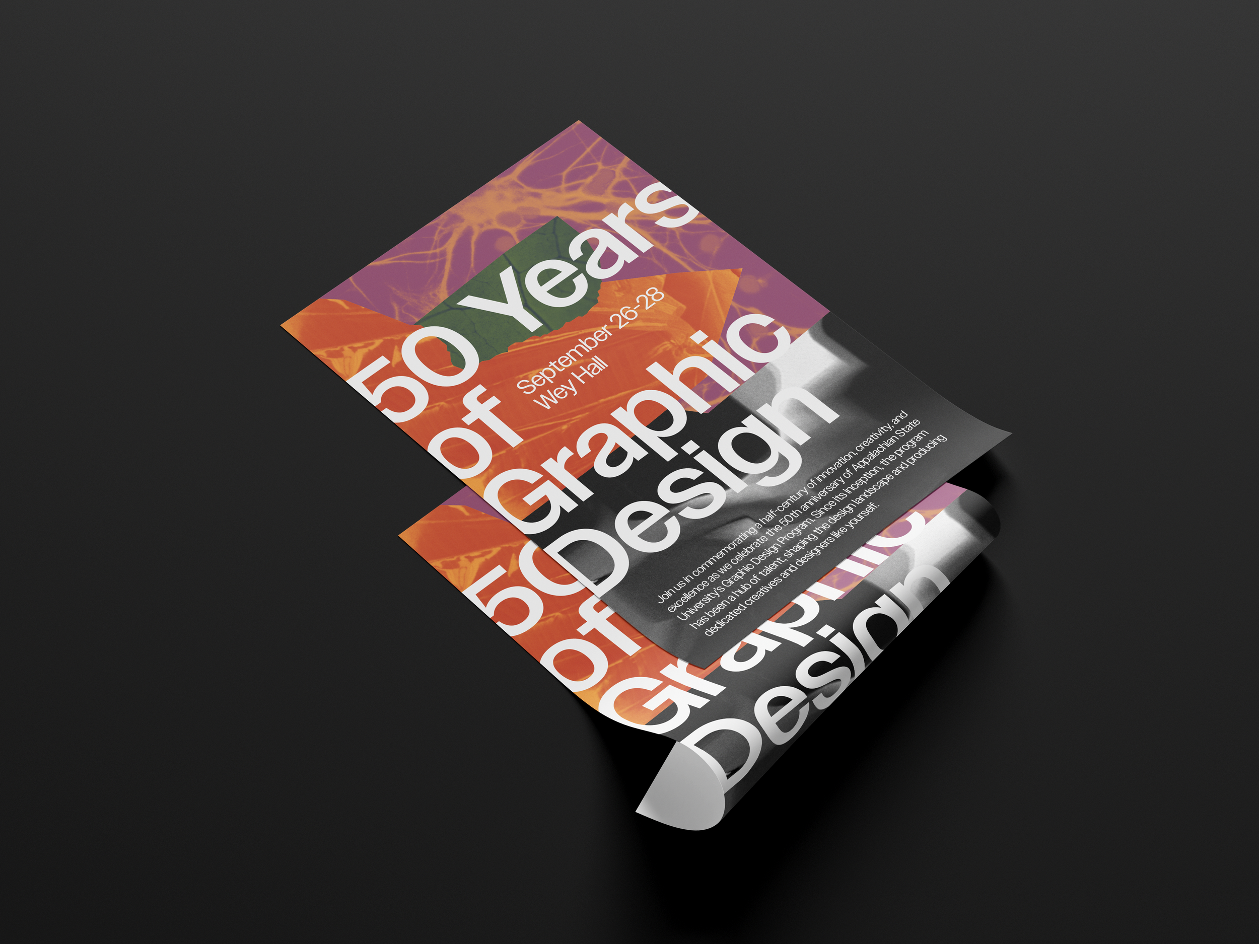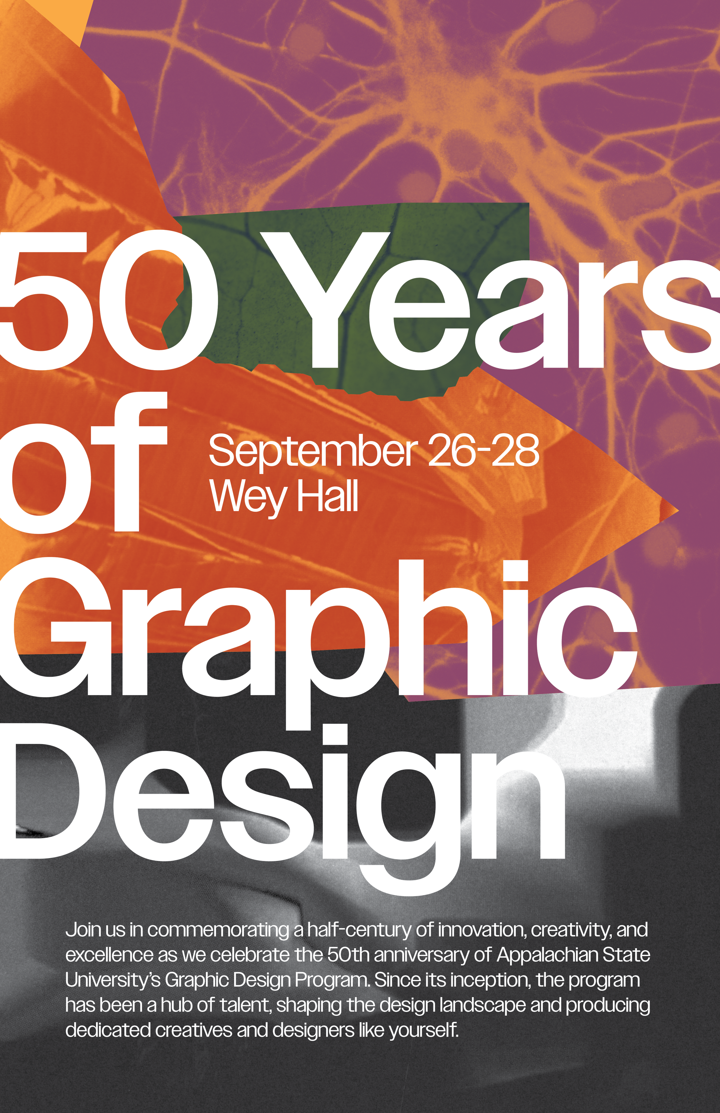 After organizing the kit, I used those materials to create a series of physical collages that combined the textures, colors, and marks into layered compositions. These collages served as the starting point for a set of posters promoting the Graphic Design program’s 50th Anniversary event. Each poster was built using only the elements from my kit—its textures, typefaces, and color palettes—forcing me to experiment with composition, scale, and hierarchy within a limited set of tools. Starting from the scanned collages helped generate unexpected layouts and visual relationships, which I then refined digitally into a set of distinct poster directions.